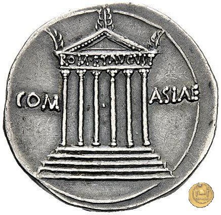 Testa di Augusto rivolta verso destra. Un tempio esastilo con fregio iscritto e tetto decorato.