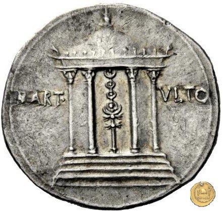 Testa di Augusto rivolta verso destra. Un tempio circolare con quattro colonne visibili e con al suo interno un vessillo.