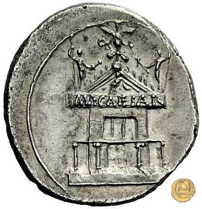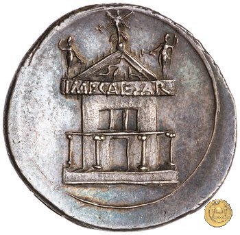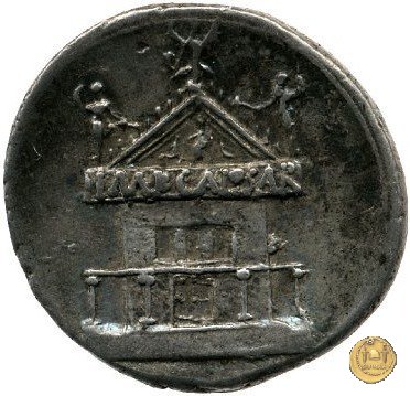 Un tempio (Curia Giulia?) con intorno un portico a colonne e architrave iscritto. Nel frontone una figura seduta in mezzo a due animali. Il tetto è sormontato, al centro, da una Vittoria su globo e ai lati da due guerrieri.