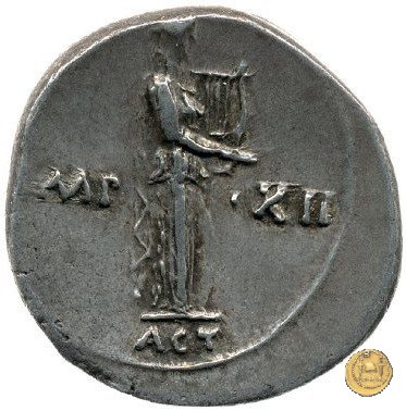 Testa di Augusto, laureata, rivolta verso destra. Apollo Citharoedus (Citaredo), drappeggiato, in piedi verso destra. La mano destra è tesa (con un plettro?) e la sinistra tiene una lira.