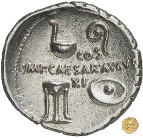 In alto a sinistra un simpulum, in alto a destra un lituus, in basso a sinistra un tripode e in basso a destra una patera.