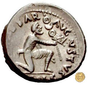 Un partico in ginocchioni rivolto verso destra. Con la mano destra tiene uno stendardo con un vessillo iscritto.