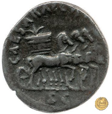 Una quadriga, con carro a forma di modio contenente tre spighe di grano, rivolta verso destra.