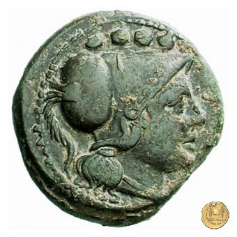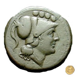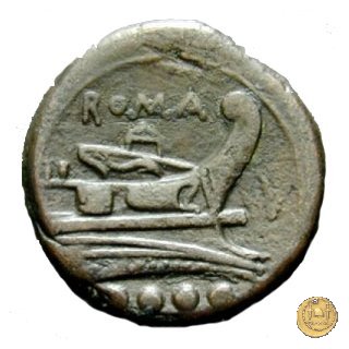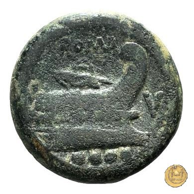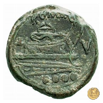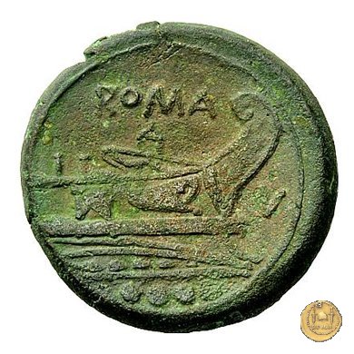 Testa elmata di Minerva a destra. In alto quattro globetti. Prora di nave a destra. In alto: ROMA ; davanti: V ; in basso quattro globetti.