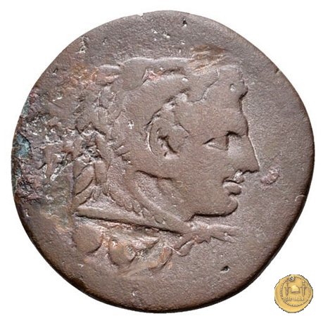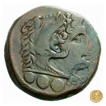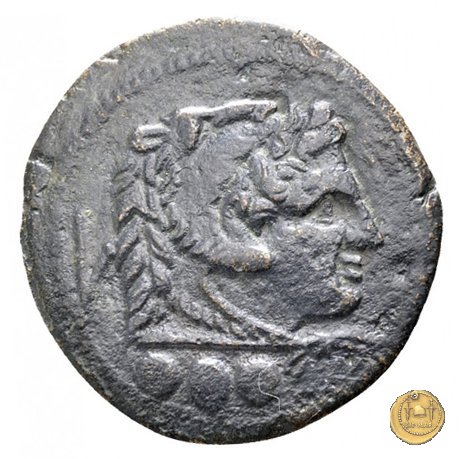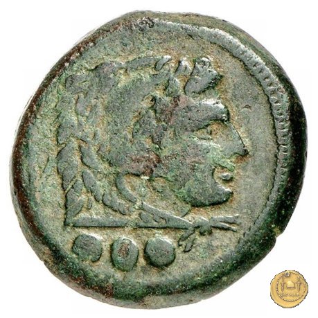 Testa di Ercole a destra, con il capo avvolto nella pelle leonina. In basso tre globetti.