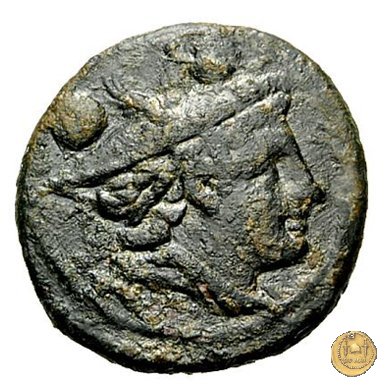 Testa di Mercurio a destra, con petaso alato. In alto due globetti.