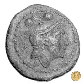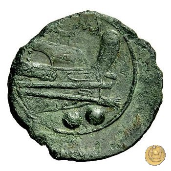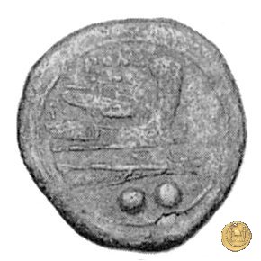 Testa di Mercurio a destra, con petaso alato. In basso: L ; in alto due globetti. Prora di nave a destra. In alto: ROMA ; in basso due globetti.