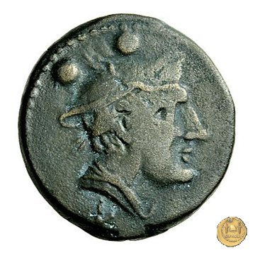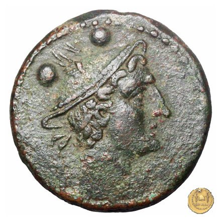 Testa di Mercurio a destra, con petaso alato. In basso: L ; in alto due globetti.