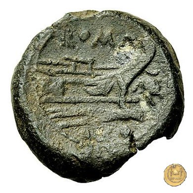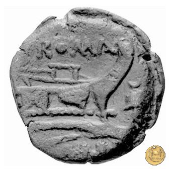 Testa di Ercole a destra, con il capo avvolto nella pelle leonina. Dietro tre globetti. Prora di nave a destra. In alto: ROMA ; davanti un elmo; in basso tre globetti.