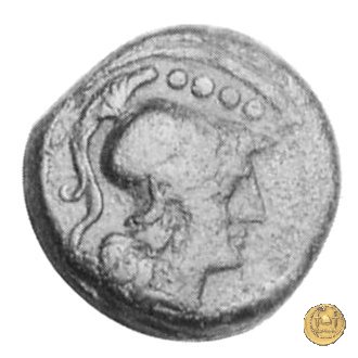 Testa elmata di Minerva a destra. In alto quattro globetti.