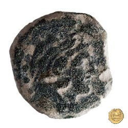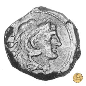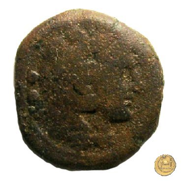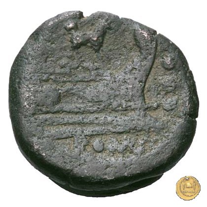 Testa di Ercole a destra, con il capo avvolto nella pelle leonina. Dietro tre globetti. Prora di nave a destra. In alto un cane; davanti tre globetti; in basso: ROMA