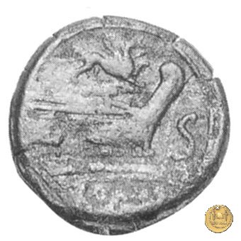 Testa laureata di Saturno a destra. Dietro: S Prora di nave a destra. In alto un grifone e la testa di una lepre; davanti: S ; in basso: ROMA