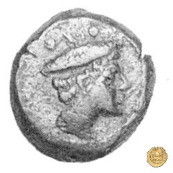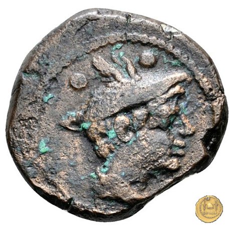 Testa di Mercurio a destra, con petaso alato. In alto due globetti.