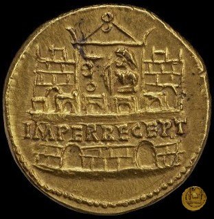Un castro pretorio con all'interno un soldato con in mano una lancia rivolto verso sinistra; davanti al guerriero, un'aquila.