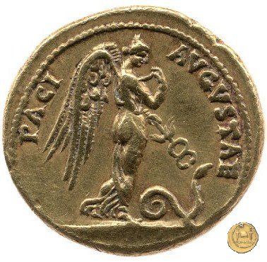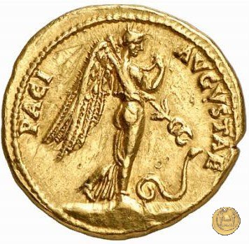 Pax-Nemesis, alata e rivolta verso destra; in mano tiene un caduceo, anch'esso alato e puntato verso un serpente a terra.