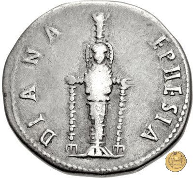La statua di Diana Ephesia con un polos in testa e delle catene ai polsi che la reggono a terra.