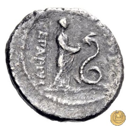 Busto della Vittoria a destra. Una fanciulla in atto di nutrire un serpente eretto di fronte a lei.
