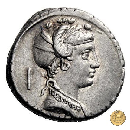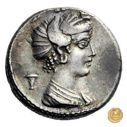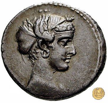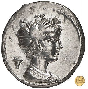 Busto drappeggiato femminile a destra, con i capelli ornati da fiori di papavero. Dietro un simbolo di controllo.