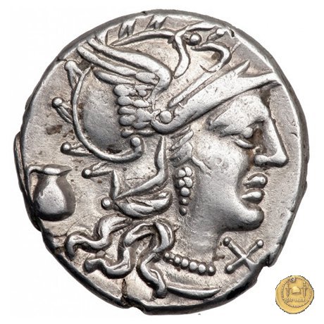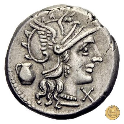 Testa di Roma a destra, con elmo attico alato. Dietro una brocca; davanti: