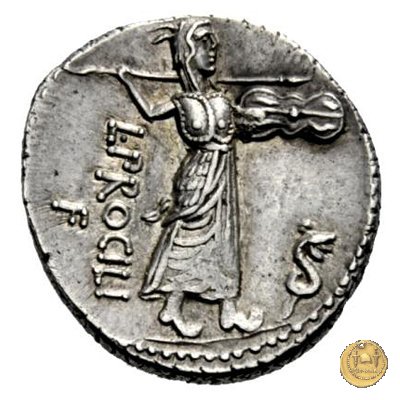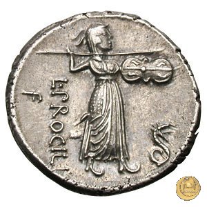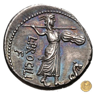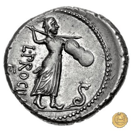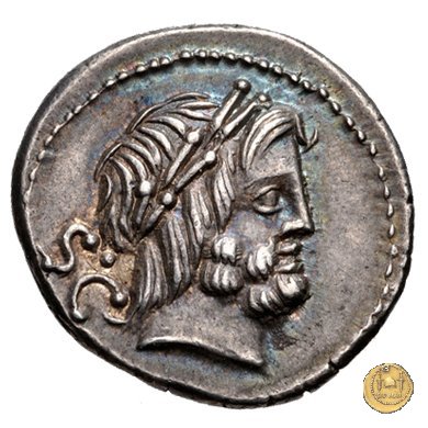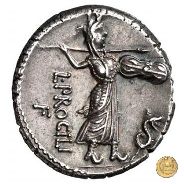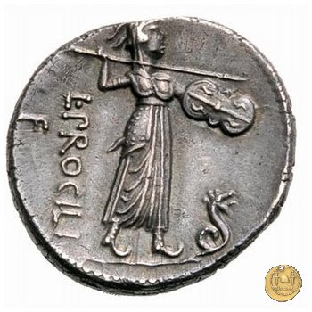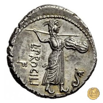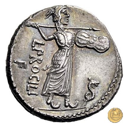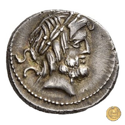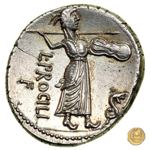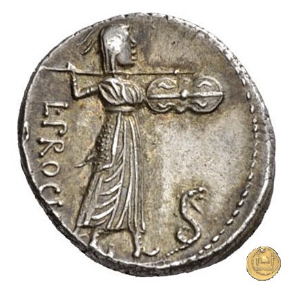 Giunone Sospita stante a destra, con copricapo di pelle caprina; tiene lo scudo oblungo con la mano sinistra e sta per scagliare la lancia con la destra. Davanti un serpente eretto.