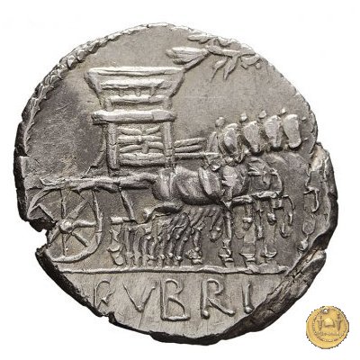 Carro trionfale trainato da quattro cavalli al passo verso destra; il fianco è decorato con un fulmine; sulla sommità la Vittoria con corona in atto di spiccare il volo.