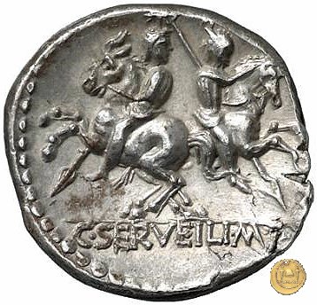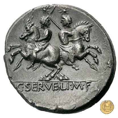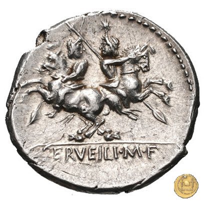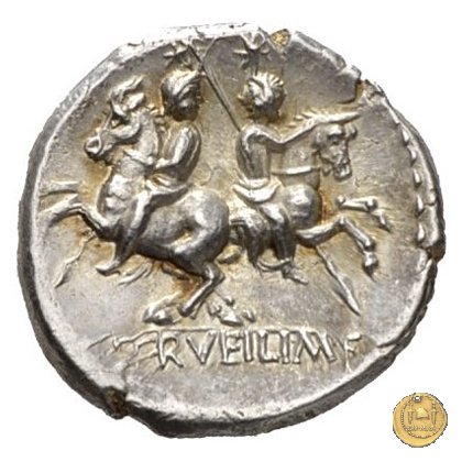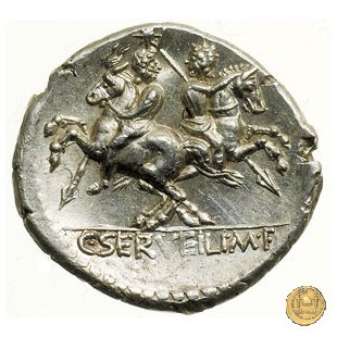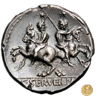I Dioscuri a cavallo in direzioni opposte, volgono il capo l'un verso l'altro; con le lance rivolte verso terra.