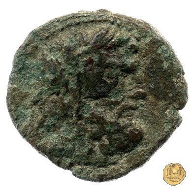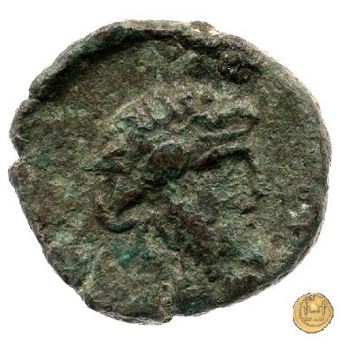 Maschera barbata di Sileno a destra, con corona di edera. Dietro tre globetti.