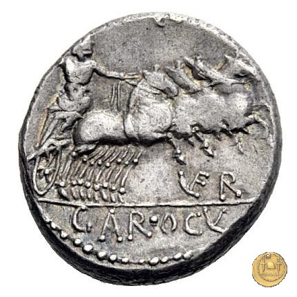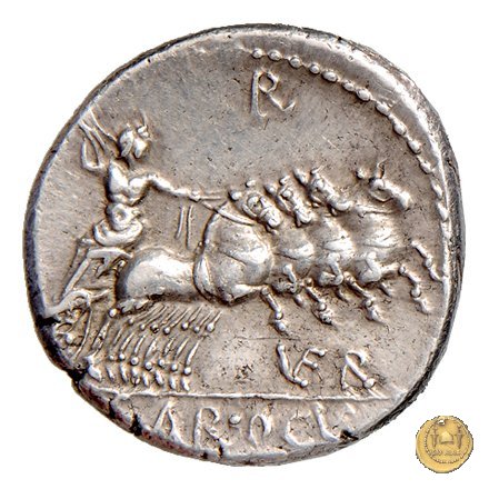 Giove su quadriga verso destra; tiene le redini con la mano sinistra e sta per scagliare il fulmine con la destra. In alto una lettera di controllo.