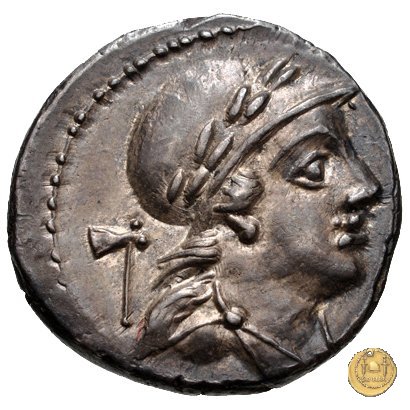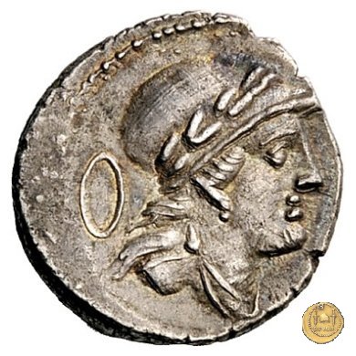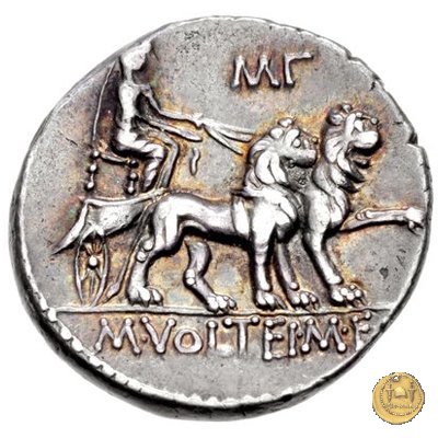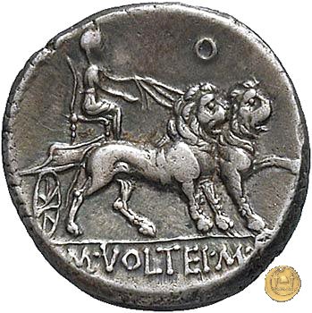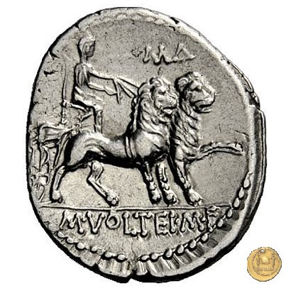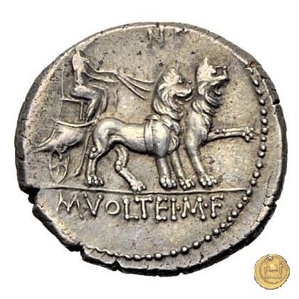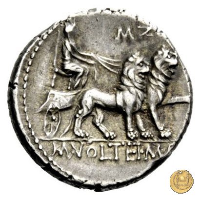 Cibele in trono su biga di leoni verso destra, con velo e con corona turrita; tiene le redini con la mano sinistra, la patera con la destra. In alto un numero di controllo.
