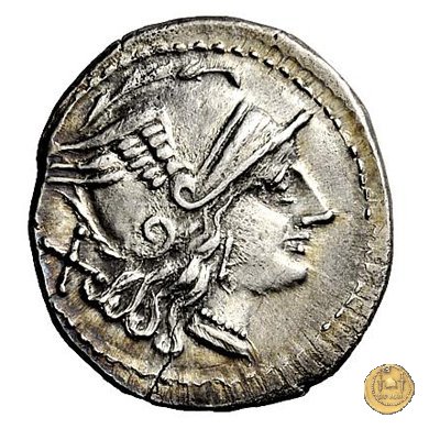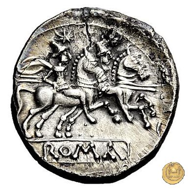 Testa di Roma a destra, con elmo attico alato. Dietro: dieci assi I Dioscuri a cavallo verso destra.