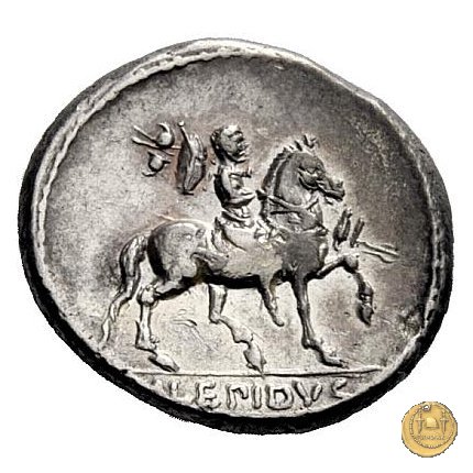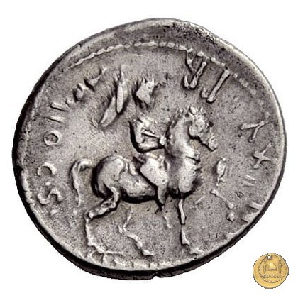 Testa femminile a destra, laureata e con diadema. Figura equestre a destra; sulle spalle del cavaliere un trofeo.