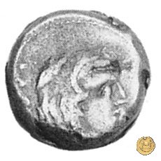 Testa di Ercole a destra, con il capo avvolto nella pelle leonina. Dietro tre globetti.