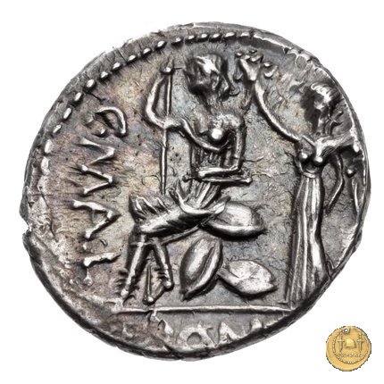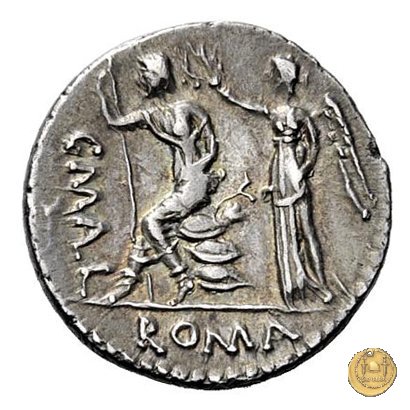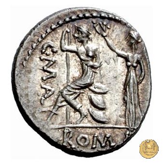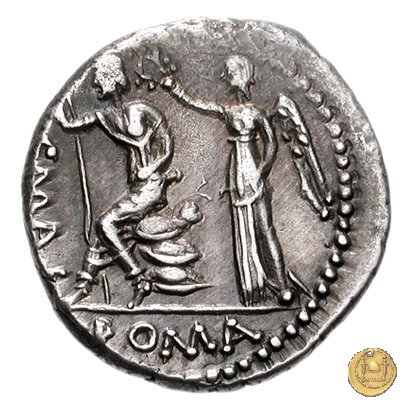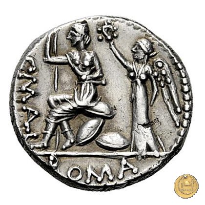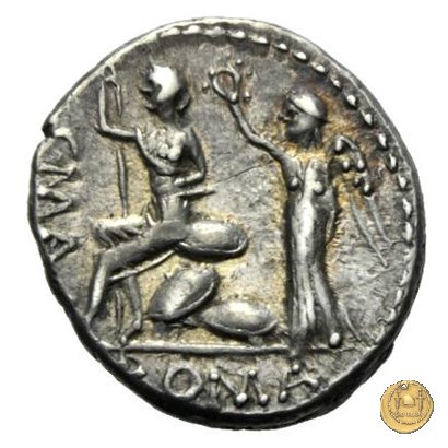 Roma, elmata e drappeggiata, seduta a sinistra su una pila di scudi; tiene il parazonium con la mano sinistra, la lancia con la destra; viene incoronata dalla Vittoria stante dietro.