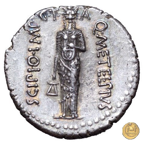 L'emissione è curata da Q. Caecilius Q.f. Q.n. Metellus Pius Scipio Nasica insieme al luogotenente P. Licinius P.f. Crassus Iunianus Damasippus. |