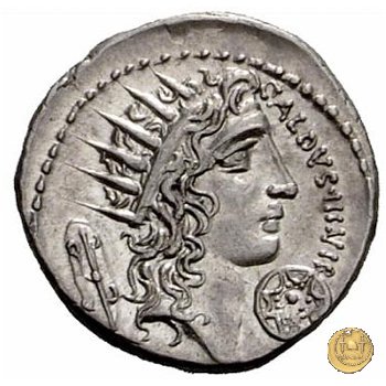 Testa del Sole a destra, con corona radiata. Dietro uno scudo ovale decorato con un fulmine; davanti uno scudo macedone rotondo.