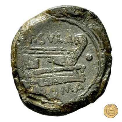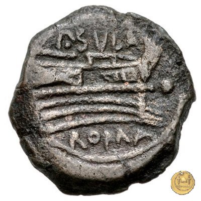 Prora di nave a destra (l'acrostolium è ornato con una testa femminile). In alto: P. SVLA ; davanti un globetto; in basso: ROMA