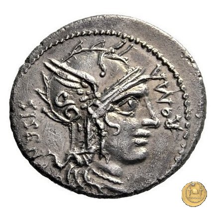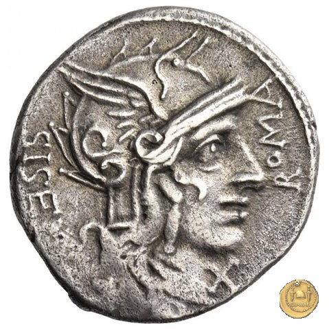 Testa di Roma a destra, con elmo attico alato. Davanti: