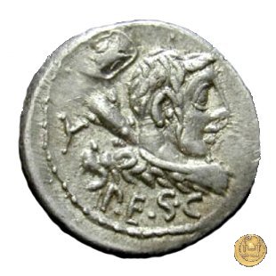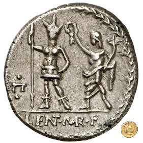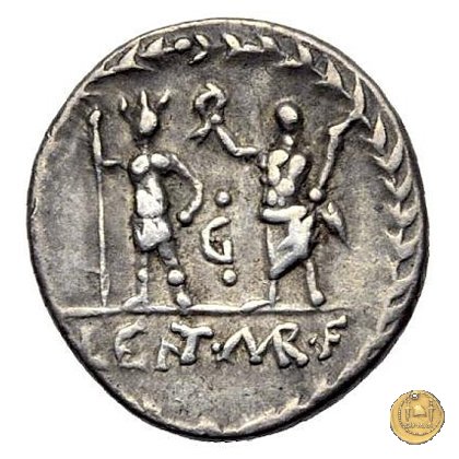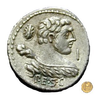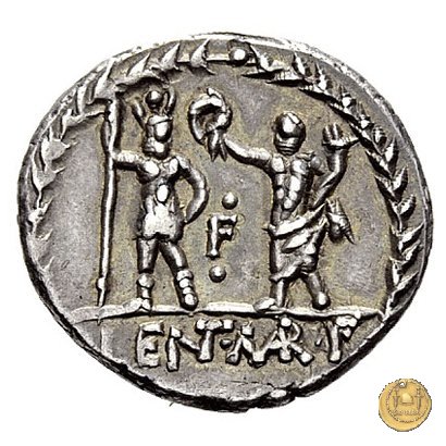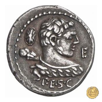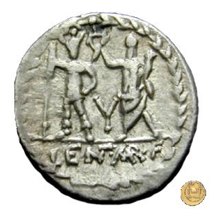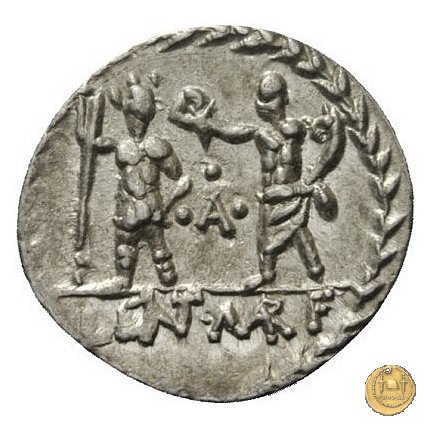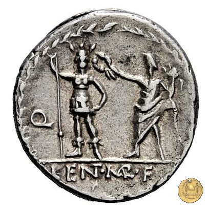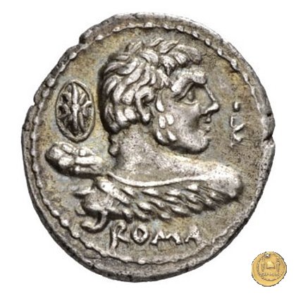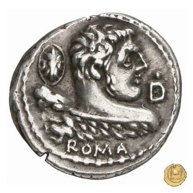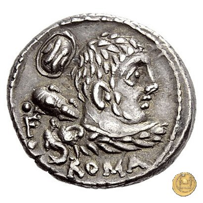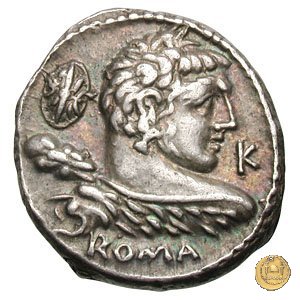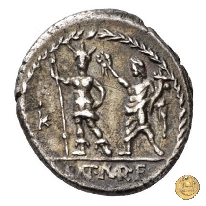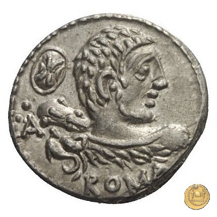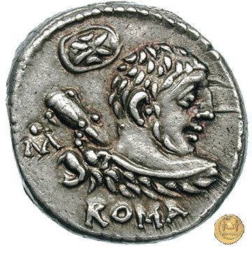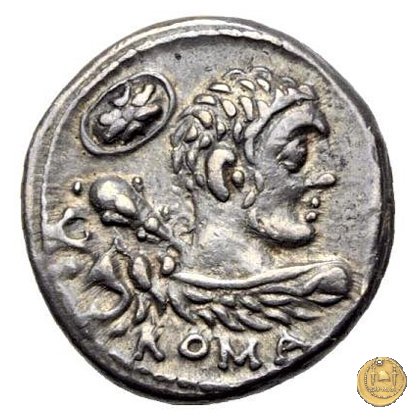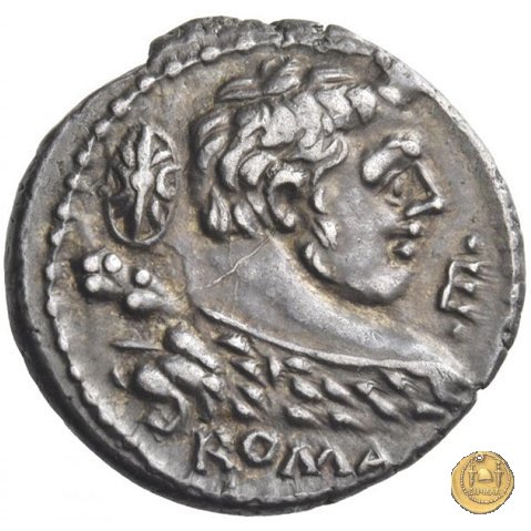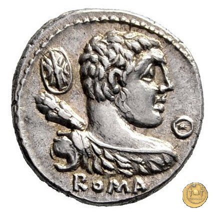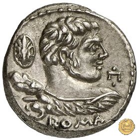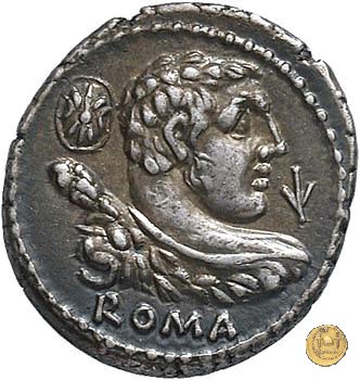 Roma stante frontalmente, con elmo ornato di triplice cresta; con la mano destra tiene la lancia, mentre la sinistra è poggiata sul fianco. A destra una figura maschile (il Genius Populi Romani): tiene una cornucopia con la mano sinistra e sta per incoronare Roma. Nel campo una lettera di controllo. Una corona d'alloro come contorno.
