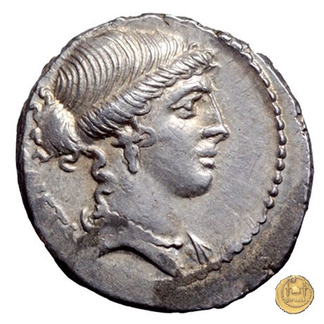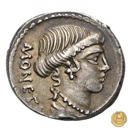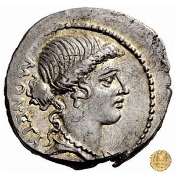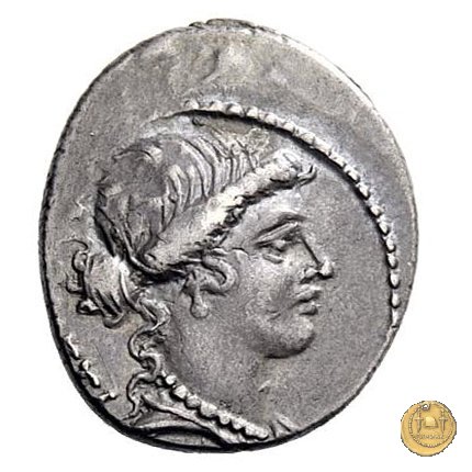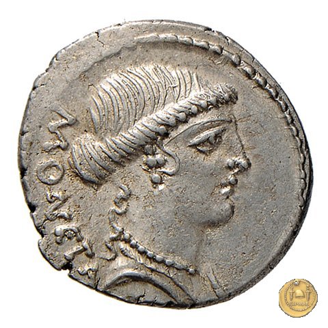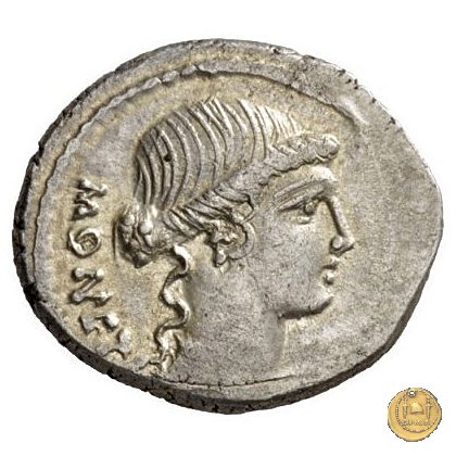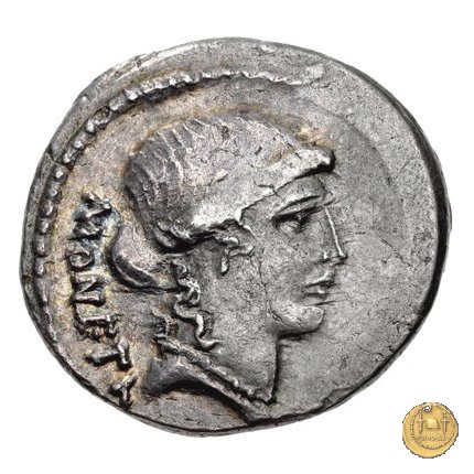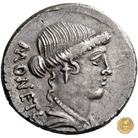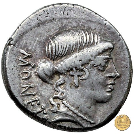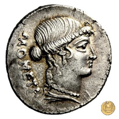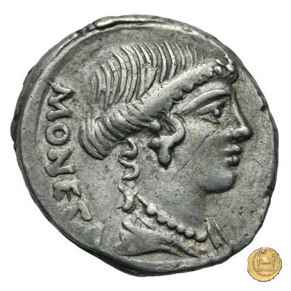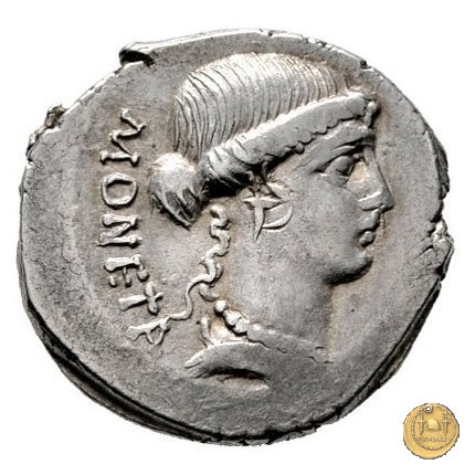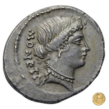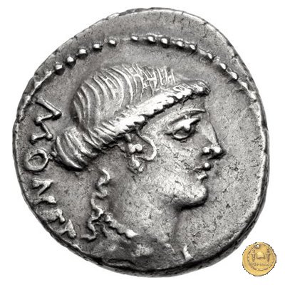 Testa di Giunone Moneta a destra. Incudine con punzone inghirlandato; a sinistra le tenaglie, a destra il martello. Una corona d'alloro come contorno.