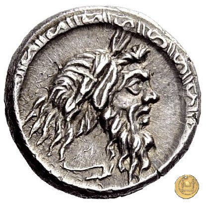 Maschera barbata di Sileno a destra. Sotto un aratro (oppure ROMA). Un torques come contorno. La Vittoria su biga verso destra; tiene un ramo di palma e le redini con la mano sinistra, la frusta con la destra. In basso un carnyx.
