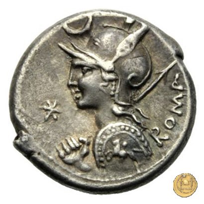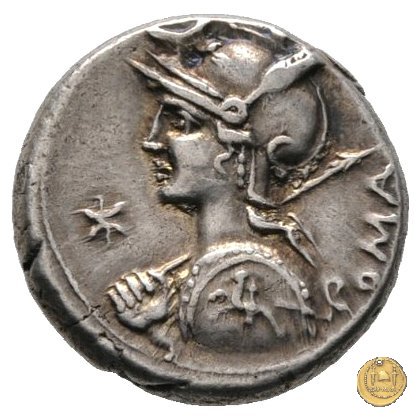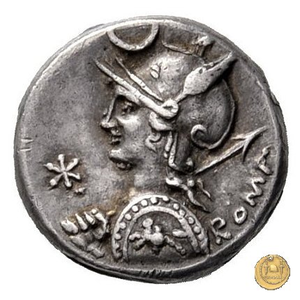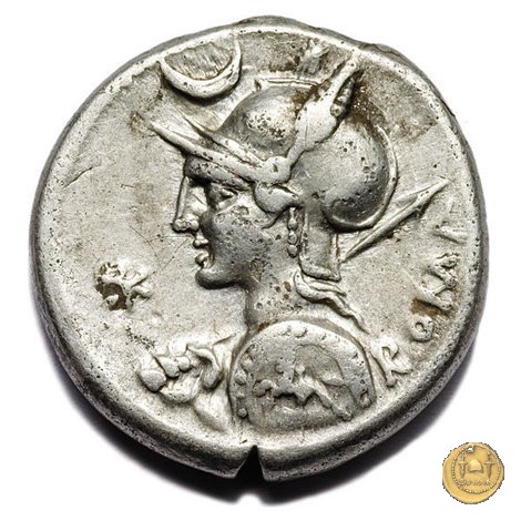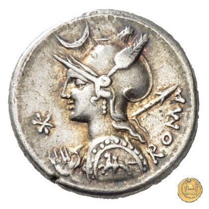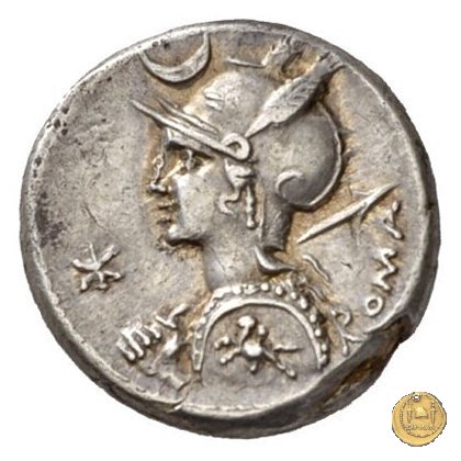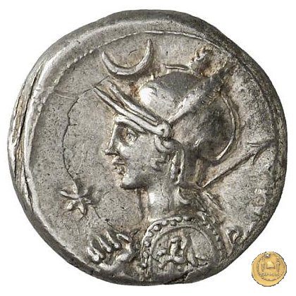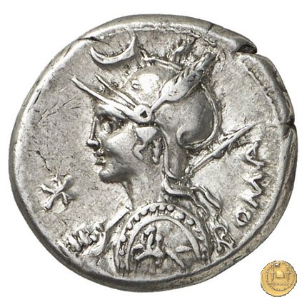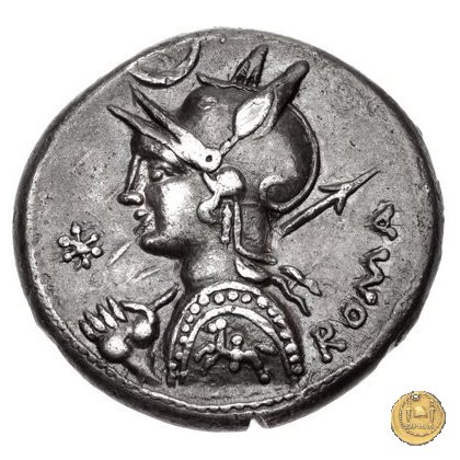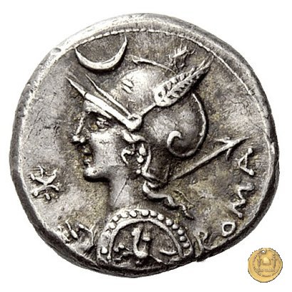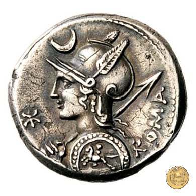 Busto di Roma a sinistra, con elmo attico alato ornato di piuma ai lati; con la mano sinistra tiene lo scudo decorato con un cavaliere al galoppo, con la mano destra impugna la lancia appoggiata sulla spalla. In alto un crescente. Davanti: