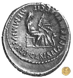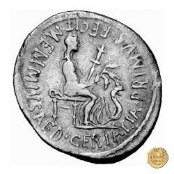 Cerere, velata e drappeggiata, seduta a destra; tiene la torcia con la mano sinistra, tre spighe di grano con la destra, una rocca per filare sotto il braccio. Davanti un serpente eretto.
