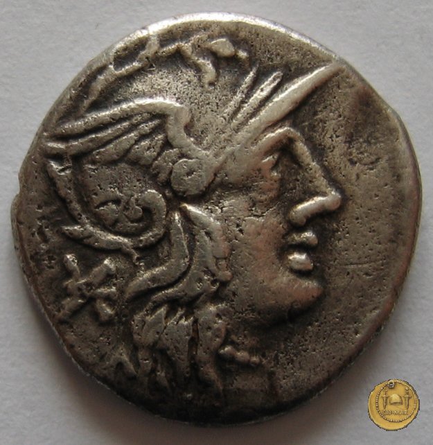 Testa di Roma a destra, con elmo attico alato. Dietro: