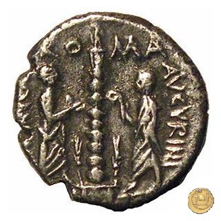 Colonna a blocchi sovrapposti con capitello sormontato da una statua togata che tiene un'asta nella mano destra; alla base della colonna due spighe di grano. La figura togata a sinistra tiene nelle mani del pane(?) e poggia il piede sinistro sul modius. La figura togata a destra tiene il lituus con la mano destra.