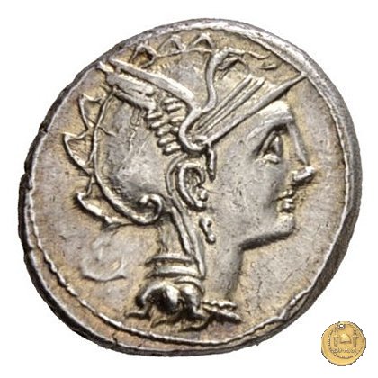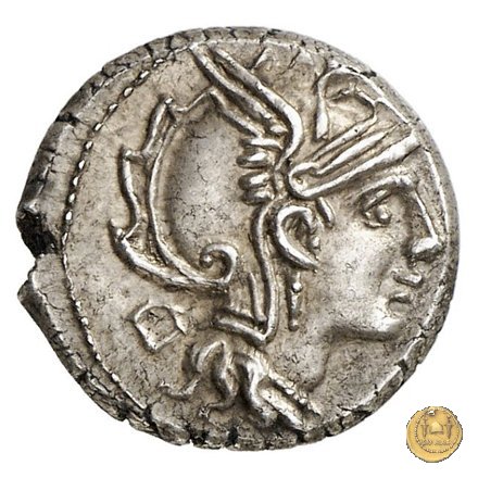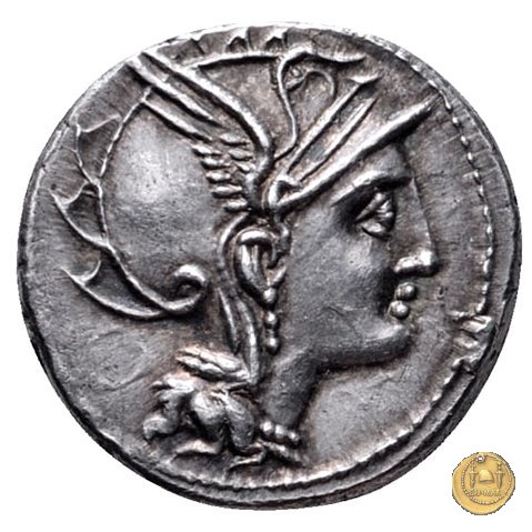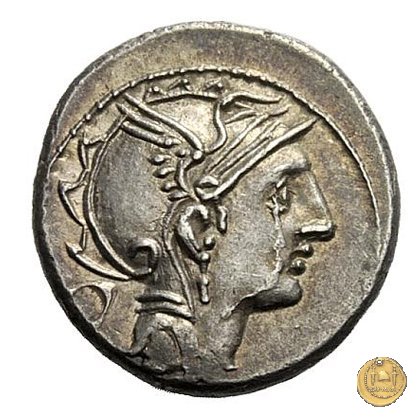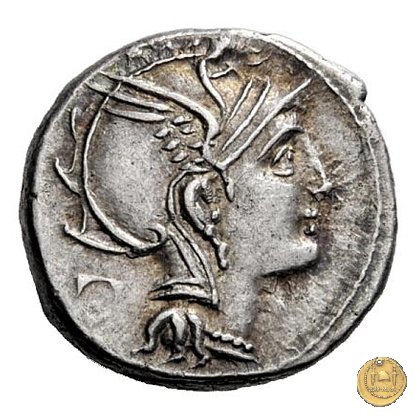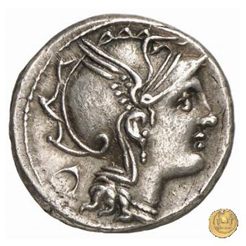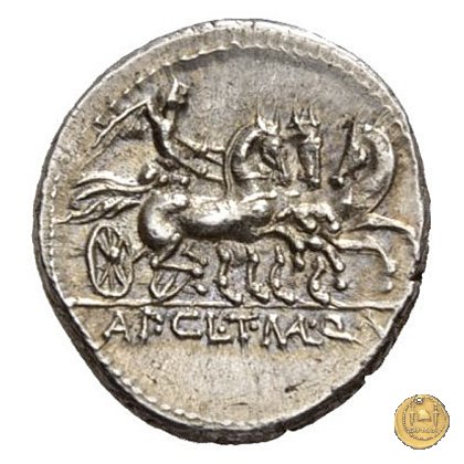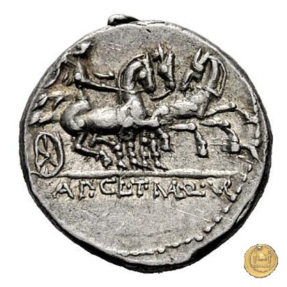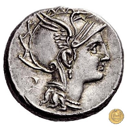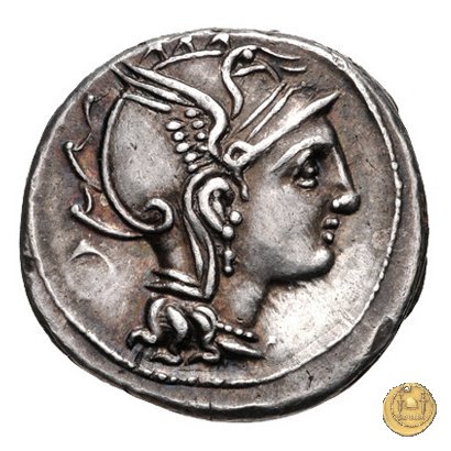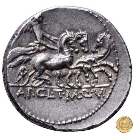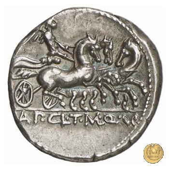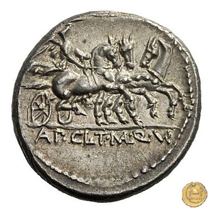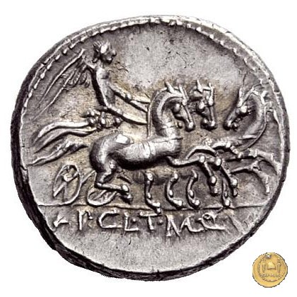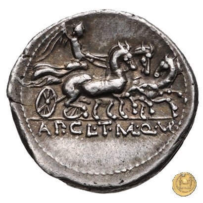 | Emissione congiunta di tre magistrati monetari: Ap. Claudius Ap.f. Cn.n. Pulcher, T. Manlius Mancinus e Q. Urbinus. Con legenda: T. MAL . AP. CL. Q. VR (Cr. 299/1b - scheda R-G80/1). |