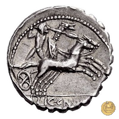 Guerriero nudo su biga verso destra; tiene lo scudo, il carnyx e le redini con la mano sinistra e sta per scagliare la lancia con la destra.