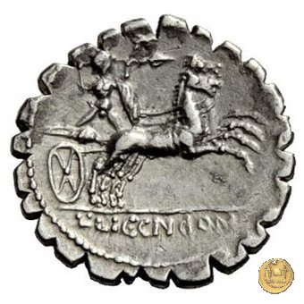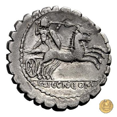 Guerriero nudo su biga verso destra; tiene lo scudo, il carnyx e le redini con la mano sinistra e sta per scagliare la lancia con la destra.