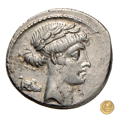 Testa laureata di Apollo a destra; con una rosetta davanti l'orecchio. Dietro un sandalo.