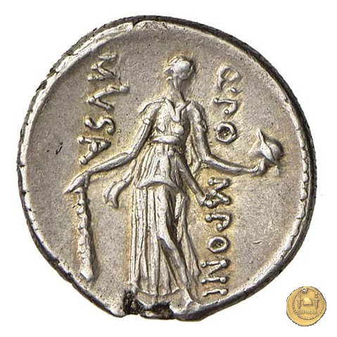 Testa laureata di Apollo a destra; con una rosetta davanti l'orecchio. Dietro uno scettro.