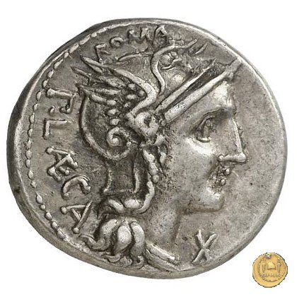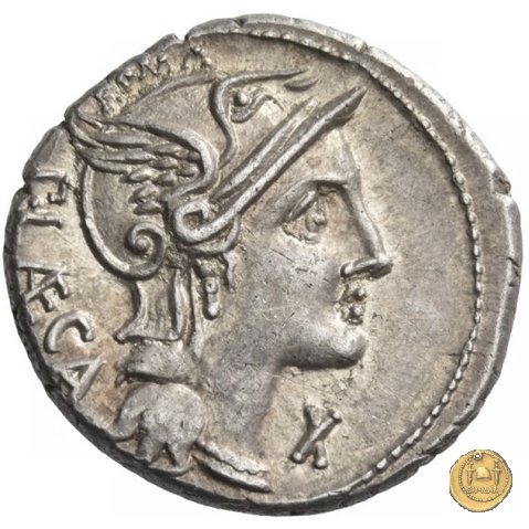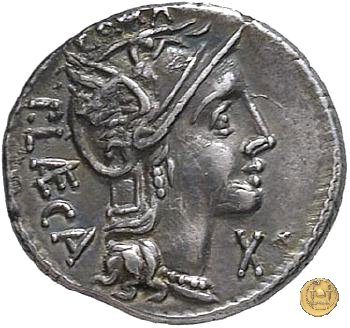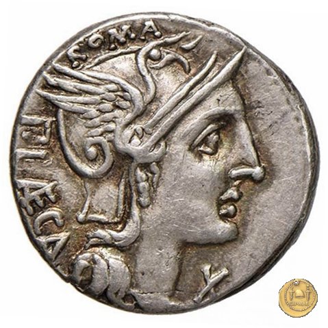 Testa di Roma a destra, con elmo attico alato. Davanti: